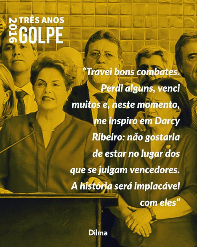 É o segundo golpe de estado que enfrento na vida. O primeiro, o golpe militar, apoiado na truculência das armas, da repressão e da tortura, me atingiu quando era uma jovem militante. O segundo, o golpe parlamentar desfechado hoje por meio de uma farsa jurídica, me derruba do cargo para o qual fui eleita pelo povo.
