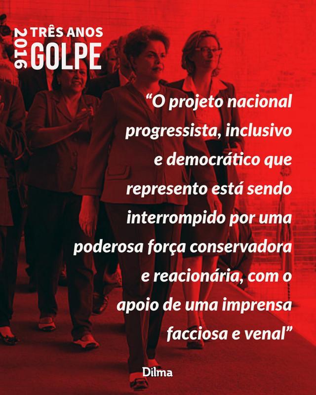 O projeto nacional progressista, inclusivo e democrático que represento está sendo interrompido por uma poderosa força conservadora e reacionária, com o apoio de uma imprensa facciosa e venal. Vão capturar as instituições do Estado para colocá-las a serviço do mais radical liberalismo econômico e do retrocesso social.