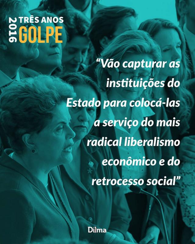 Em histórico discurso em 31 de agosto de 2016, a presidenta foi profética. “Vão capturar as instituições do Estado para colocá-las a serviço do mais radical liberalismo econômico e do retrocesso social”, denunciou