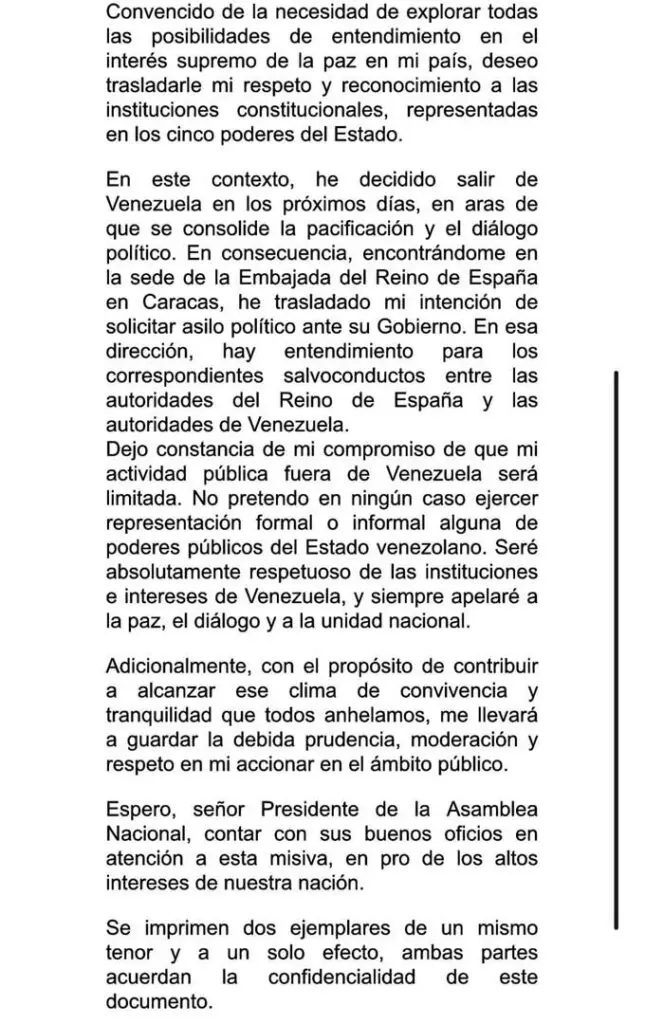 “Não pretendo em nenhum caso exercer qualquer representação formal ou informal dos poderes públicos do Estado venezuelano. “Serei absolutamente respeitoso com as instituições e os interesses da Venezuela e apelarei sempre à paz, ao diálogo e à unidade nacional”, afirma o texto vazado.