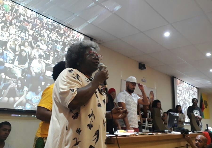 Ao microfone, Jupiara Castro – Núcleo de Consciência Negra (NCN) da USP. Foto: Uneafro