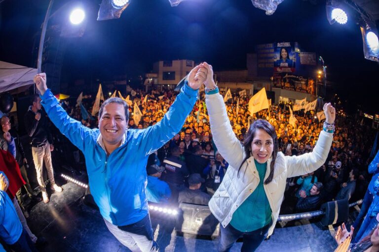 Luisa González e Andrés Arauz, candidatos do Revolução Cidadã comemoraram junto à militância. Foto: Lospanas