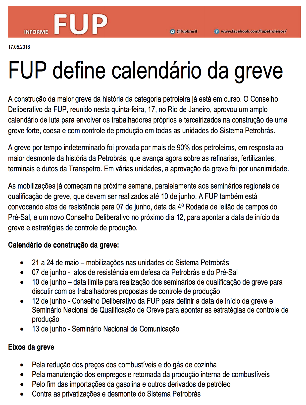 Todo apoio à greve dos petroleiros e à possibilidade de uma greve geral ampla contra o golpe dos canalhas.