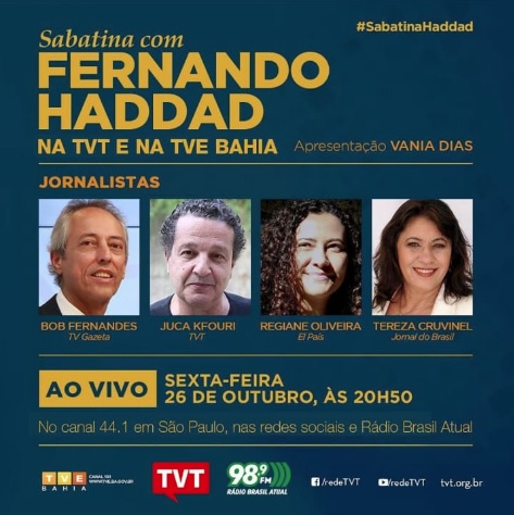 Em vez de Globo, TVE e TVT fazem sabatina ao vivo com Haddad nesta sexta, às 20h50; Viomundo retransmitirá