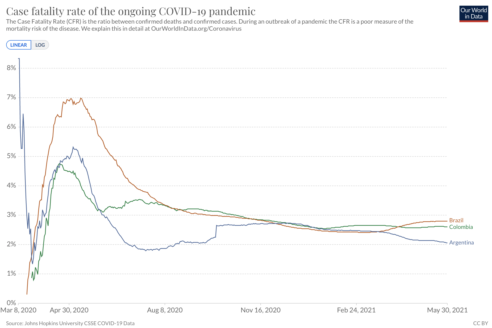 O Brasil lidera Colômbia e Argentina na taxa de óbitos por casos confirmados de coronavírus.
