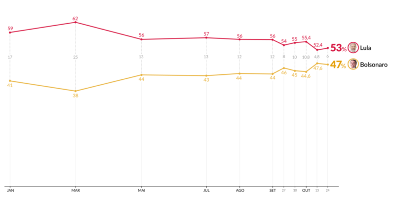 Lula tem 54% dos votos válidos, e Bolsonaro, 46%.