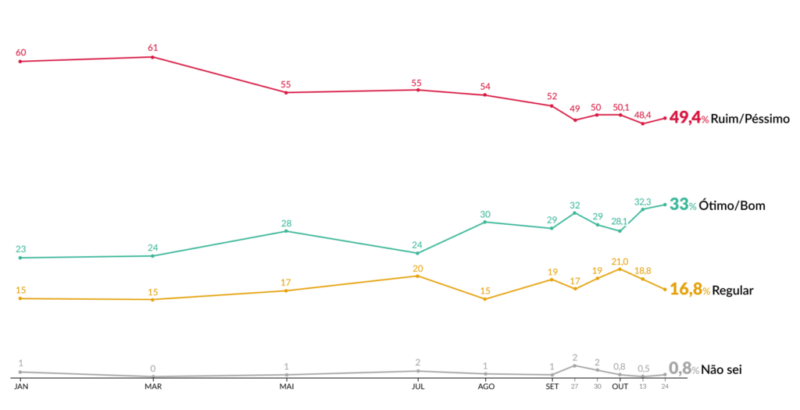 - O percentual de eleitores que avalia a gestão de Bolsonaro como ruim ou péssima subiu 1 ponto percentual – de 48,4% para 49,4%