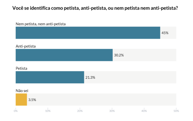 Por fim, vale a pena observar que apenas 21,3% da população se declara “petista”, enquanto 30,2% se diz antipetista.