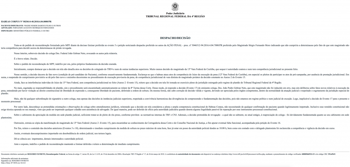 Em seguida, o relator Gebran Neto interferiu, pela manutenção da prisão de Lula: “Despacho o presente feito em caráter excepcional, portanto, tendo em vista flagrante vício que está a justificar minha intervenção, vez que resta evidente que o desembargador de plantão foi induzido em erro pelos impetrantes, pois partiram de pressuposto de fato inexistente”.