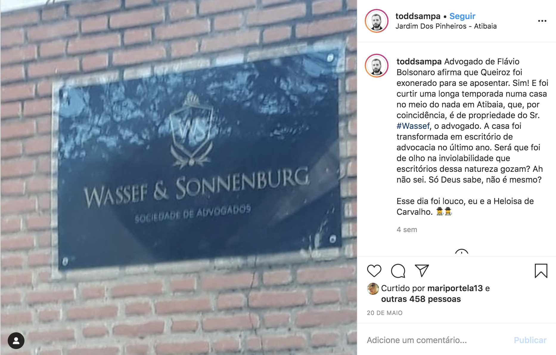 No dia 20 de maio, ela publicou uma foto de uma placa do escritório de Wassef em Atibaia.