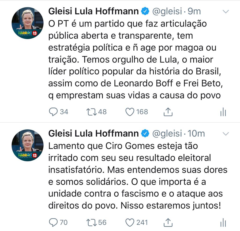 No twitter, a senadora Gleisi Hoffmann, presidenta do PT, mandou recado para Ciro. Ela foi uma das atacadas na entrevista.