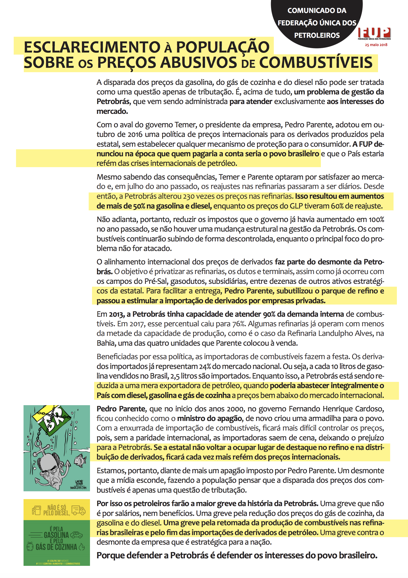 Os trabalhadores do Sistema Petrobrás iniciarão o movimento a partir do primeiro minuto de quarta-feira, 30 de maio, para baixar os preços do gás de cozinha e dos combustíveis, contra a privatização da empresa e pela saída imediata do presidente Pedro Parente, que, com o aval do governo Michel Temer, mergulhou o país numa crise sem precedentes.