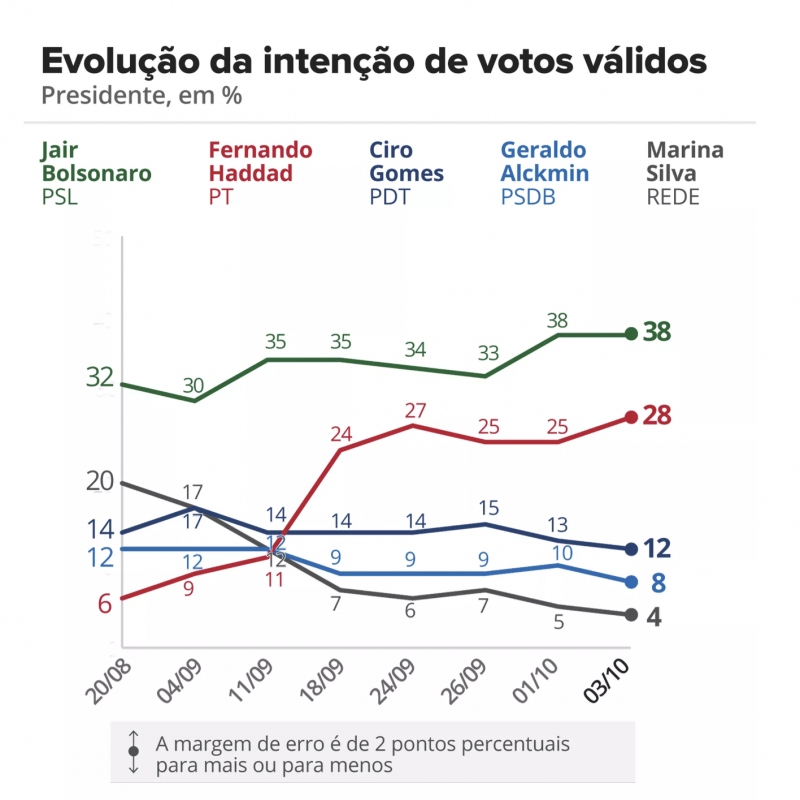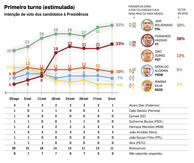 Bolsonaro passou a 32% (+1%), mas continuou com 38% dos votos válidos — precisa de 50% mais um para dispensar o segundo turno. Haddad passou de 21% a 23%.