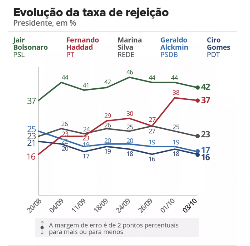 Na rejeição, Bolsonaro tem 42% — contra 37% de Haddad.