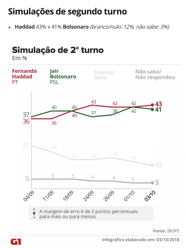 Haddad sobe e diminui chances de vitória de Bolsonaro no primeiro turno; no segundo, petista abre dois pontos de vantagem, diz Ibope