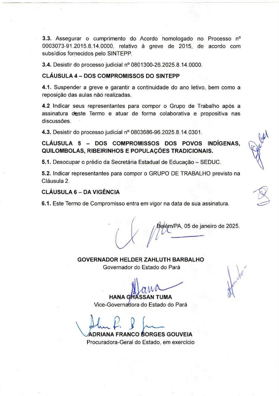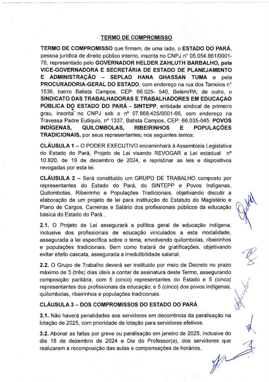 Em momento histórico e de intensa emoção para todos os envolvidos, a vice-governadora Hana Ghassan Tuma e o presidente da Assembleia Legislativa do Pará, deputado Chicão (MDB), elaboraram a minuta de um Termo de Compromisso e a minuta do projeto de lei para revogação da Lei 10.820/2024, em conjunto com as representações indígenas que ocupam a Seduc há quase um mês, quilombolas e dos professores da rede pública estadual em greve, durante reunião na sede da Secretaria de Estado de Planejamento e Administração.