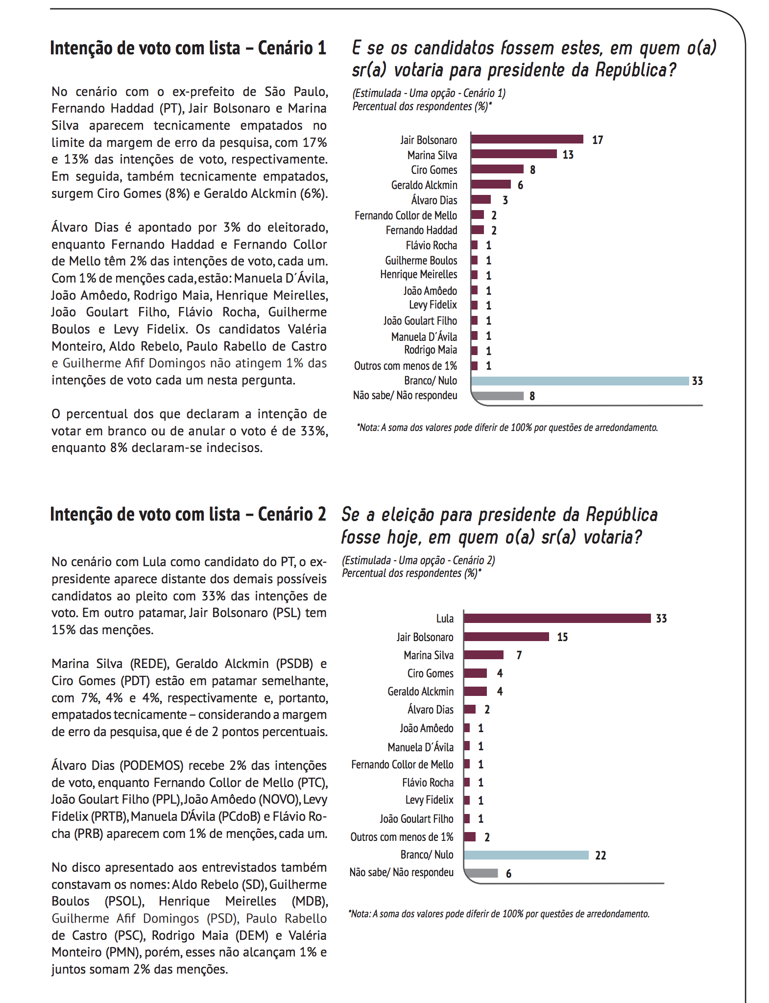 Muitos dizem por isso Lula preso, outros por isso Lula não pode continuar como preso político. A notícia é quente. Aproveite que a mídia golpista está evitando dizer a verdade, divulgam notícia falsa, escondendo o resultado (fake news), não o que a pesquisa mostra: Lula eleito no primeiro turno, tendo na margem de erro o mesmo de todos os demais candidatos e o mais do dobro do segundo colocado. Exceção de Lula, todos perdem para brancos e nulos em qualquer hipótese (com ou sem Lula).