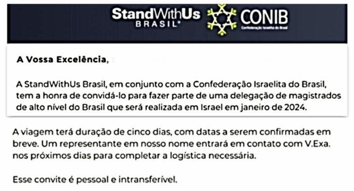 Os juízes embarcariam em duas datas, nos próximos dias 20 e 23, rumo a Tel Aviv. Além da Conib, o convite também é feito em nome da StandWithUs, que se define como uma “instituição educacional sobre Israel sem fins lucrativos”.