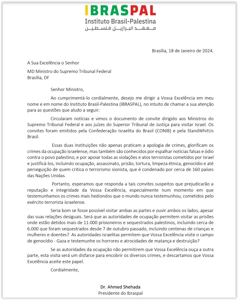 Instituto Brasil-Palestina envia carta aos ministros do STF e STJ sobre convite da Conib para visitarem Israel; íntegra