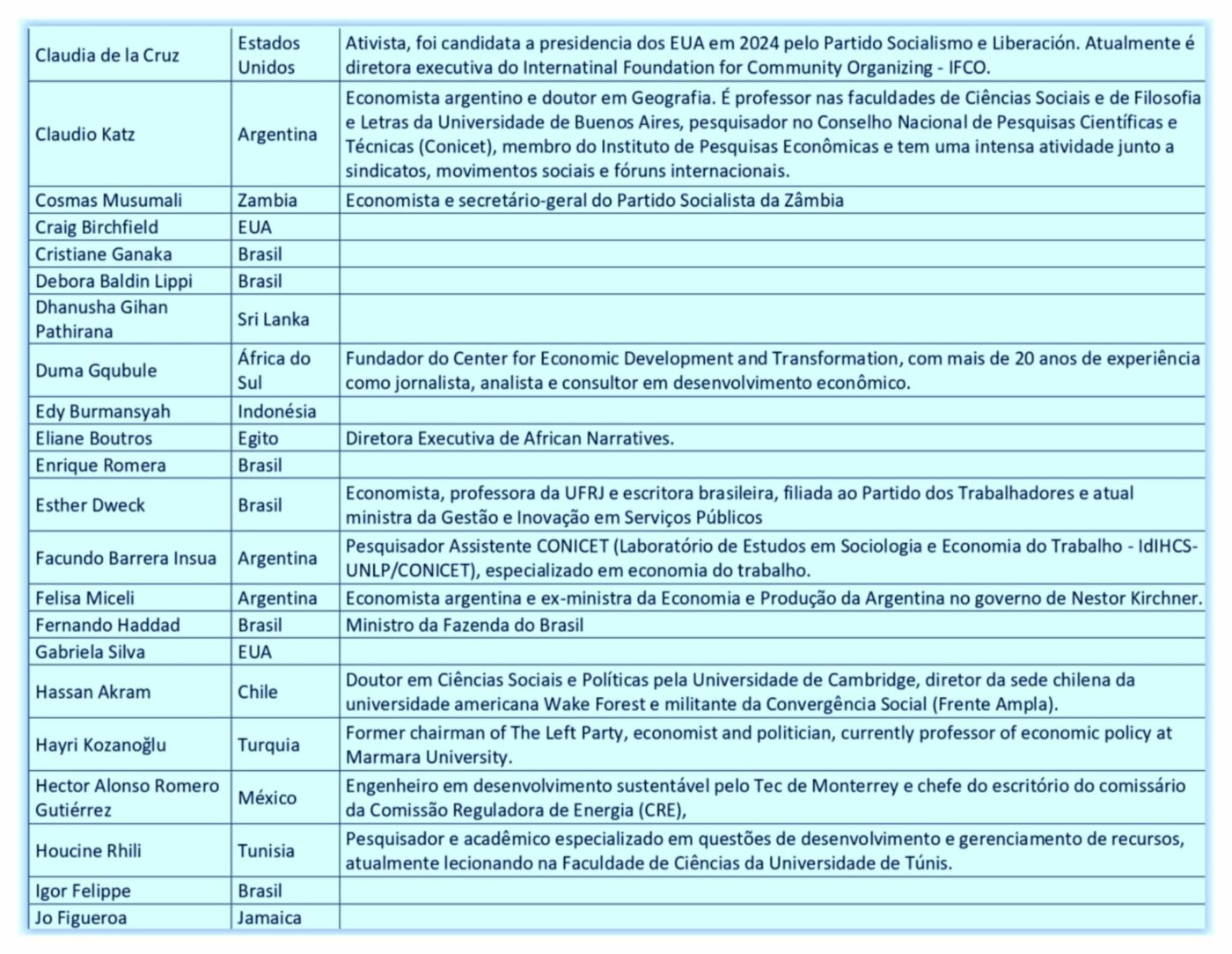 Além de Haddad, diversas outras lideranças e intelectuais, como Vijay Prashad (Índia), diretor do Instituto Tricontinental de Pesquisa Social, também estarão presentes.