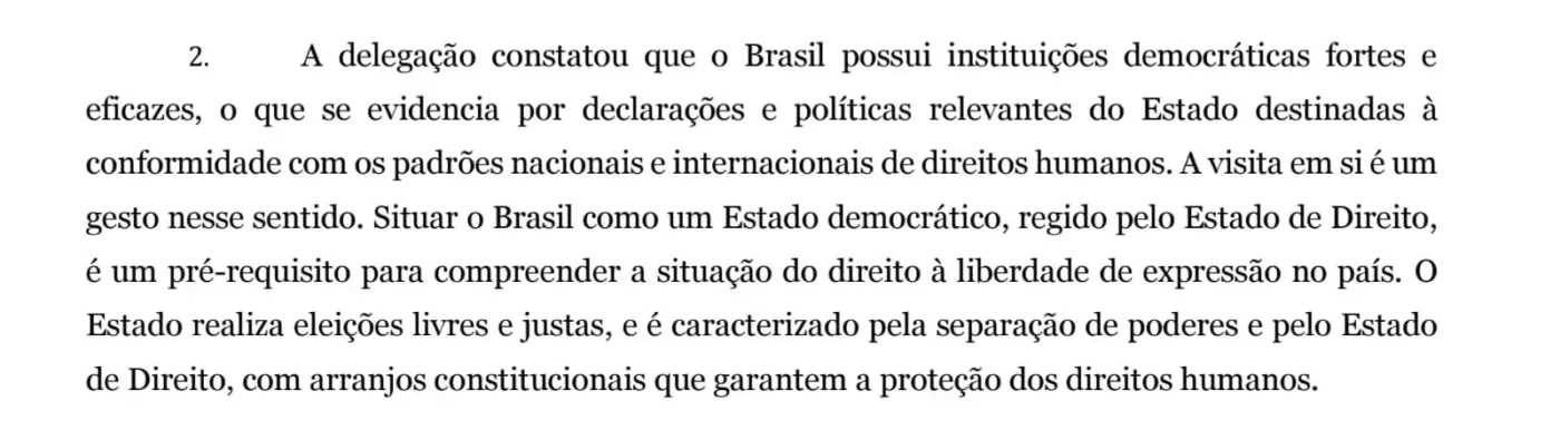 “A delegação constatou que o Brasil possui instituições democráticas fortes e eficazes, o que se evidencia por declarações e políticas relevantes do Estado destinadas à conformidade com os padrões nacionais e internacionais de direitos humanos. A visita em si é um gesto nesse sentido. Situar o Brasil como um Estado democrático, regido pelo Estado de Direito, é um pré-requisito para compreender a situação do direito à liberdade de expressão no país. O Estado realiza eleições livres e justas, e é caracterizado pela separação de poderes e pelo Estado de Direito, com arranjos constitucionais que garantem a proteção dos direitos humanos”, diz o item 2 da Introdução.