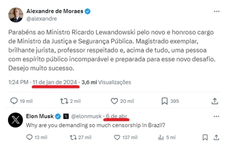 Um detalhe chama atenção no ataque inusitado de Elon Musk de 6 de abril a Alexandre de Moraes: o dono do “X”/ex-twitter aproveitou uma postagem do ministro do STF feita na plataforma em 11 de janeiro passado, ou seja, há quase três meses.