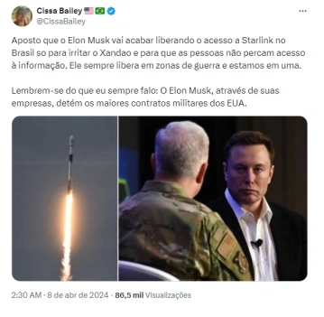 O perfil bolsonarista @CissaBailey, que se descreve como comentarista política, afirma que Musk sempre libera o acesso à Starlink “em zonas de guerra, e estamos em uma [guerra híbrida]”, lembrando que Musk “detêm os maiores contratos militares dos EUA”.