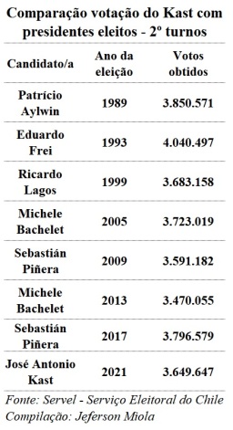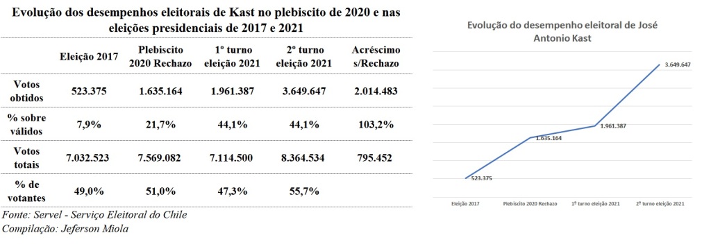 O ponto de partida de Kast não é a comparação com seu opositor direto, por quem foi derrotado, mas o desempenho dele [1] em relação a ele mesmo na eleição presidencial de 2017, quando concorreu pela primeira vez ao cargo como candidato independente, e [2] em relação à campanha do plebiscito para decidir a convocação de processo constituinte para escrever uma nova Carta constitucional para o país. No plebiscito, ele foi o principal líder e grande artífice da campanha “Rechazo”, contra a Constituinte.