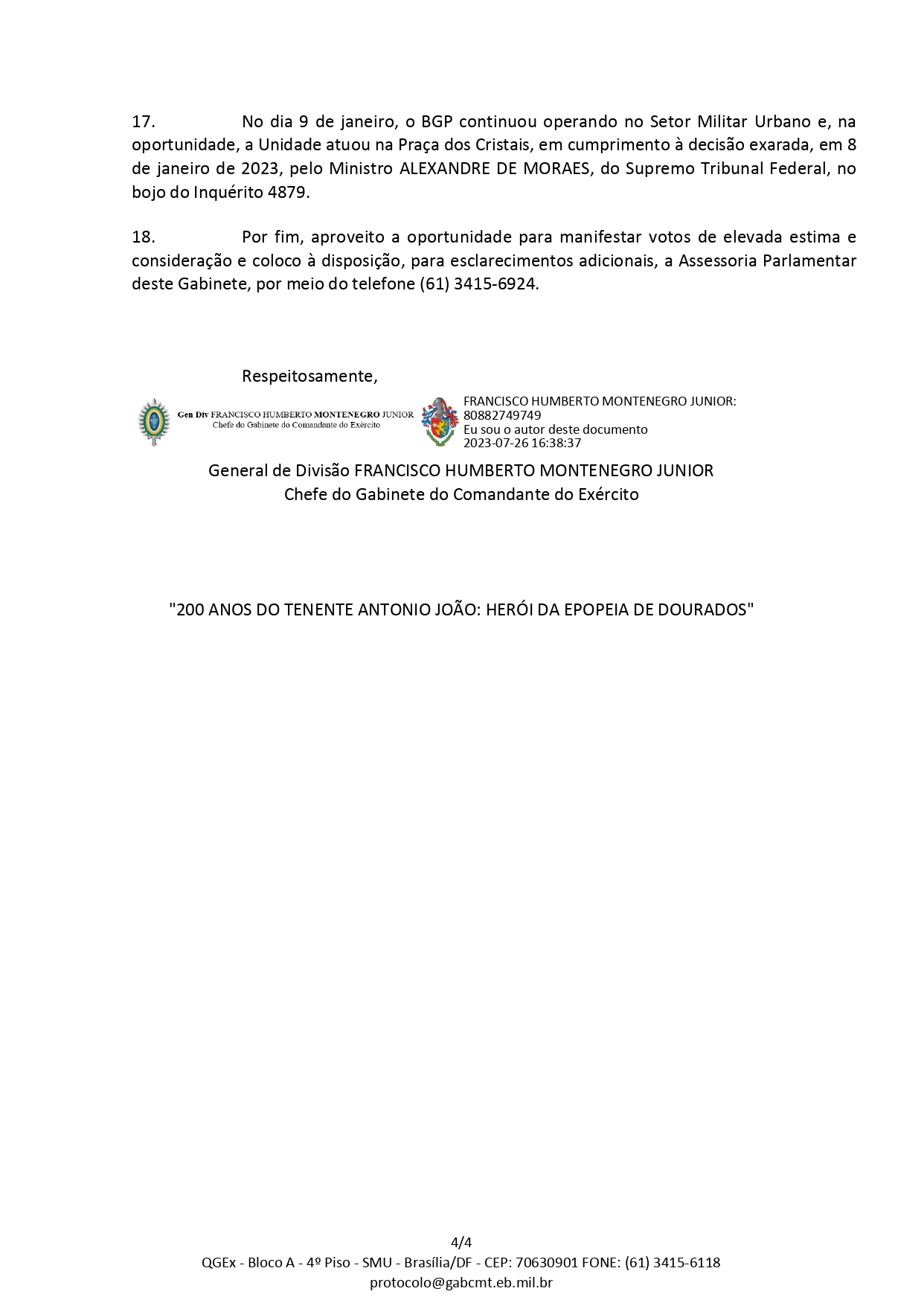 No documento, o general Tomás Paiva reitera as conclusões do inquérito de que “a responsabilidade pela segurança do Palácio do Planalto está a cargo do GSI”, assim como a responsabilidade pelo planejamento das ações de segurança dos palácios presidenciais.