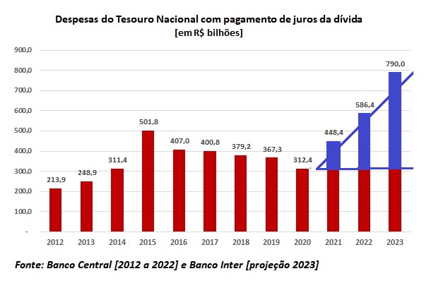 O relatório fiscal do Banco Inter de 30/1/2023 projeta que a despesa do Tesouro Nacional para o pagamento dos juros da dívida poderá atingir R$ 790 bilhões em 2023.