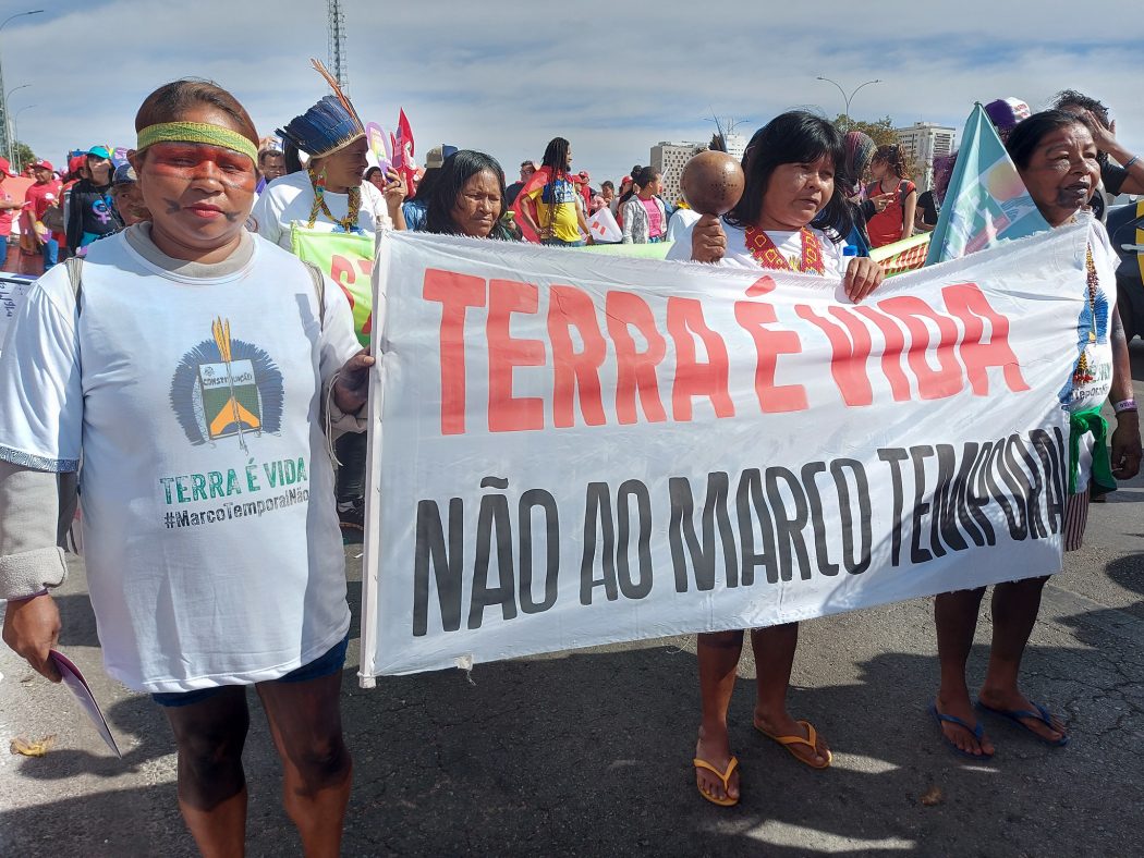 Mulheres indígenas manfiestam-se contra marco temporal na Marcha das Margaridas, em Brasília (DF), agosto de 2023. Foto: Adi Spezia/Cimi