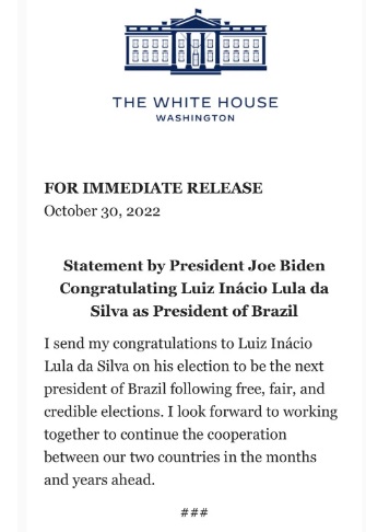 “Parabenizo Luiz Inácio Lula da Silva por ser escolhido para ser o próximo presidente do Brasil após eleições livres justas e com credibilidade. Espero que trabalhemos juntos para continuar a cooperação entre nossos dois países nos meses e anos futuros”, disse o líder americano num comunicado.