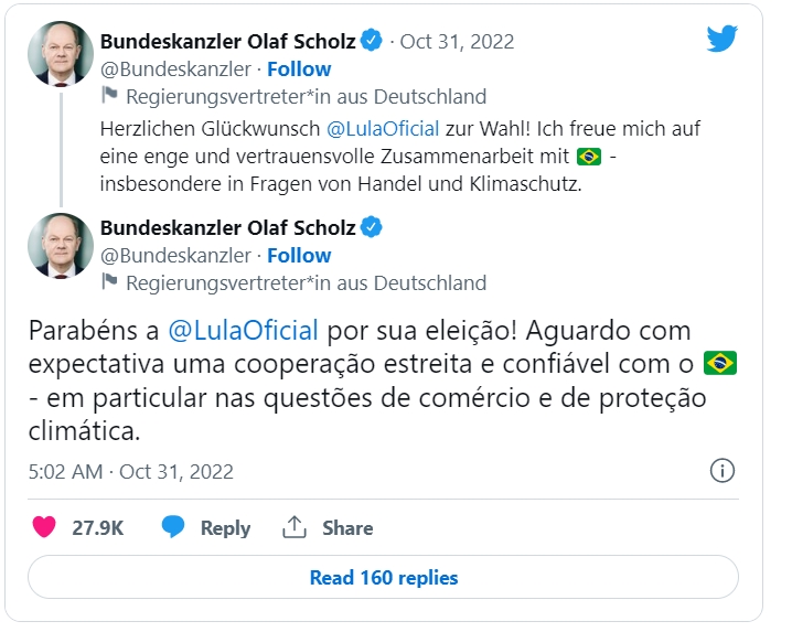 “Parabéns a @LulaOficial por sua eleição! Aguardo com expectativa uma cooperação estreita e confiável com o 🇧🇷 – em particular nas questões de comércio e de proteção climática”.