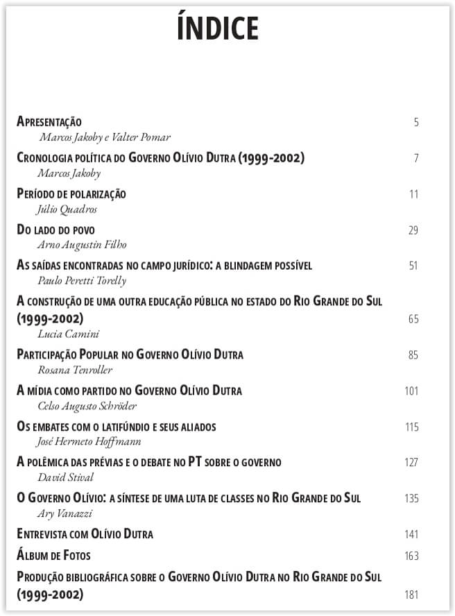 Traz também uma entrevista com Olívio Dutra, uma cronologia dos principais fatos políticos e indicações bibliográficas sobre a experiência do governo.