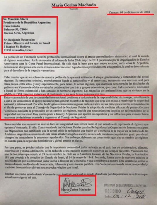 Em 4 de dezembro de 2018, Corina Machado endereçou uma carta (veja abaixo) a Mauricio Macri, então presidente da Argentina, e Benjamin Netanyahu, premiê da colonização sionazi, pedindo ajuda para que houvesse, nas próprias palavras de Corina, uma mudança de regime.