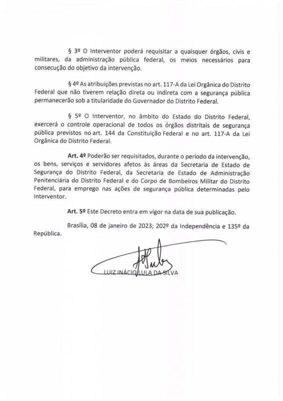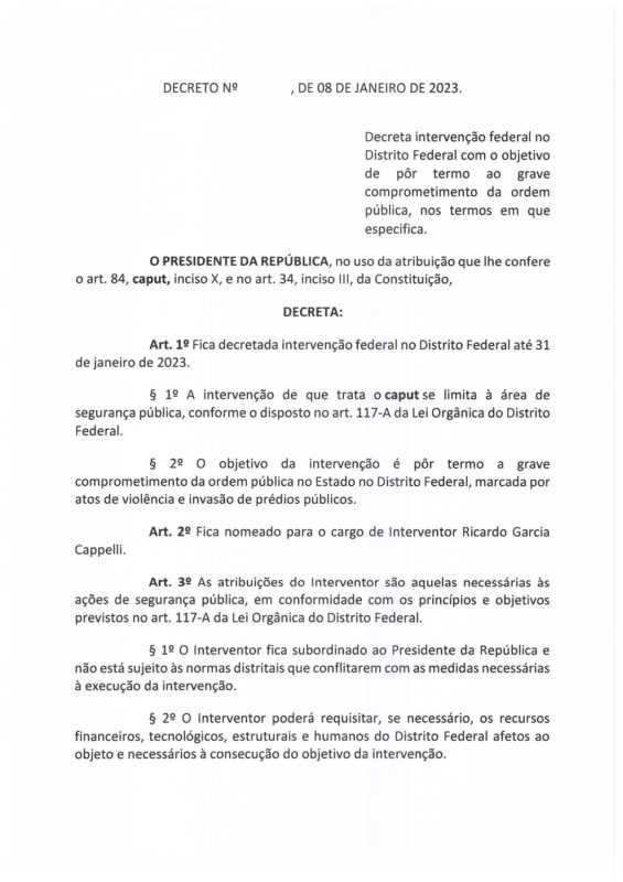 O presidente Luiz Inácio Lula da Silva (PT) decretou neste domingo, 08/01, intervenção federal na segurança pública do Distrito Federal após terroristas bolsonaristas invadirem e depredarem os prédios dos três poderes em Brasília: Palácio do Planalto, Congresso Nacional e Supremo Tribunal Federal (STF).