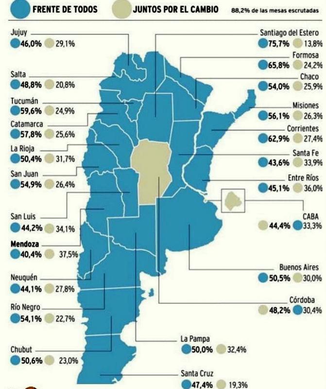 Nenhuma pesquisa eleitoral tinha previsto uma vitória tão ampla: a Frente de Todos, de Alberto Fernández e Cristina Kirchner, tinha uma vantagem de 15% na disputa contra o Juntos pela Mudança, de Maurício Macri-Miguel Ángel Pichetto, nas primárias da Argentina, com 85% dos votos contados.