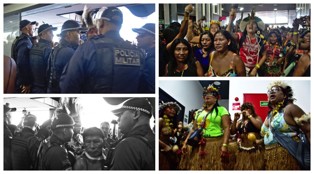 Os policiais tentaram impedir que as mulheres indígenas entrassem para entregar o documento escrito por elas, mas não conseguiram.
