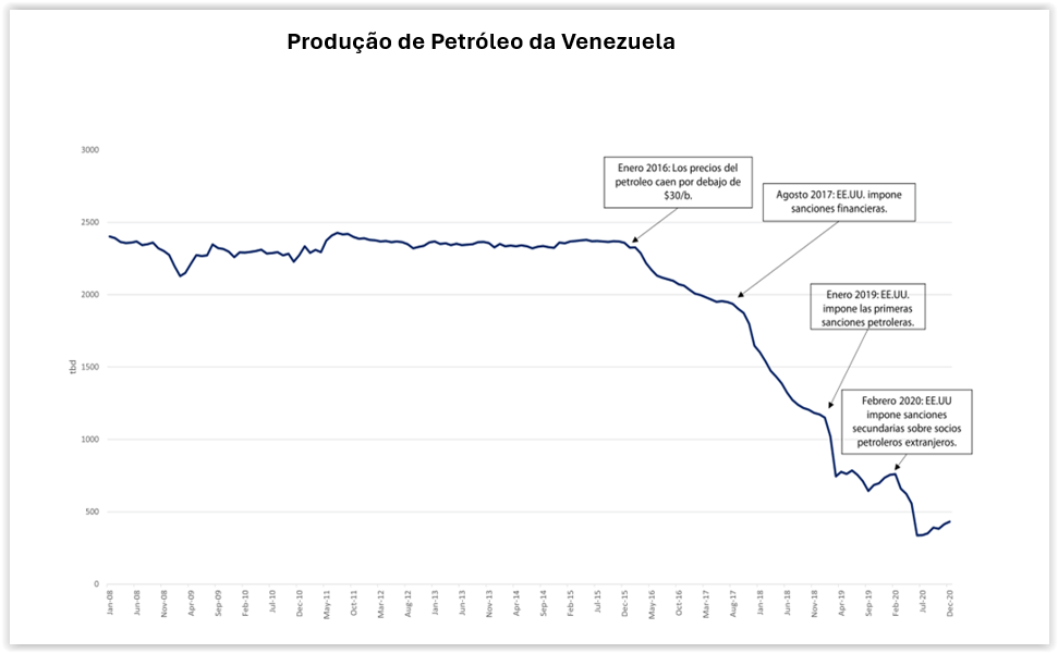 Em segundo lugar, em momento posterior, ocorreram as sanções petroleiras, que reduziram fortemente a possibilidade de a Venezuela exportar sua produção.