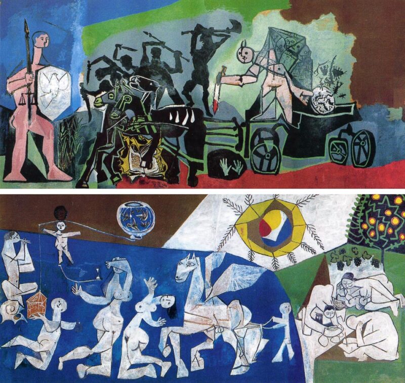 Nas paredes de uma capela do século 14, em Vallauris, na França, o pintor espanhol Pablo Picasso criou o mural acima, Guerra e Paz, 1952. Na parte superior, retrata um demônio da guerra, portador de doenças, lutando contra uma figura heroica que empunha uma lança e está protegida por uma pomba.