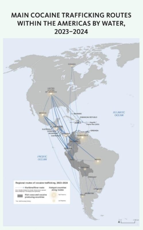 Esse mapa, feito pelo United Nations Office on Drugs and Crime (UNODOC) e que consta no seu Relatório de 2025, mostra como a Venezuela participa apenas tangencialmente do tráfico de drogas. Venezuela é somente rota, que movimenta apenas cerca de 7% da cocaína distribuída. A maioria da cocaína, bem como de outras drogas, chega aos EUA via Colômbia, Peru, Equador, México etc.