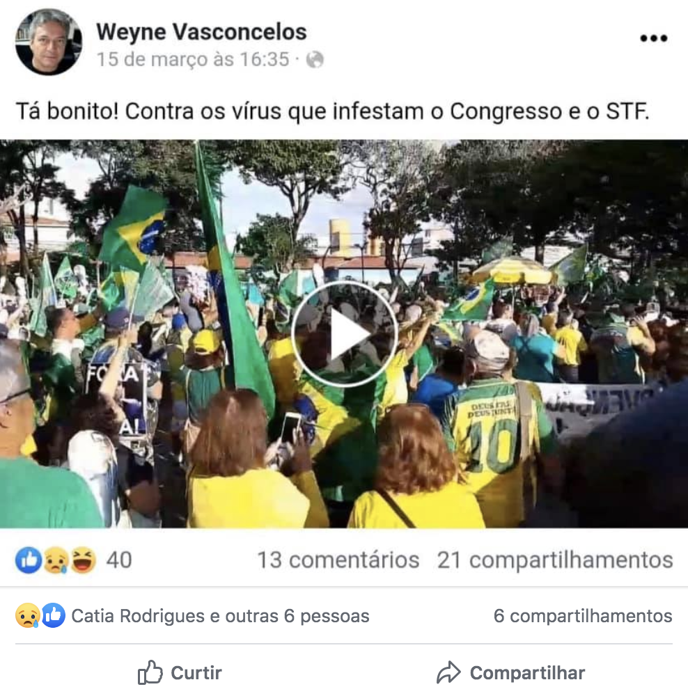 Ele havia comparecido — de máscara — ao ato do dia 15 de março, convocado pelo próprio presidente Jair Bolsonaro para denunciar os presidentes da Câmara e do Senado e o STF.