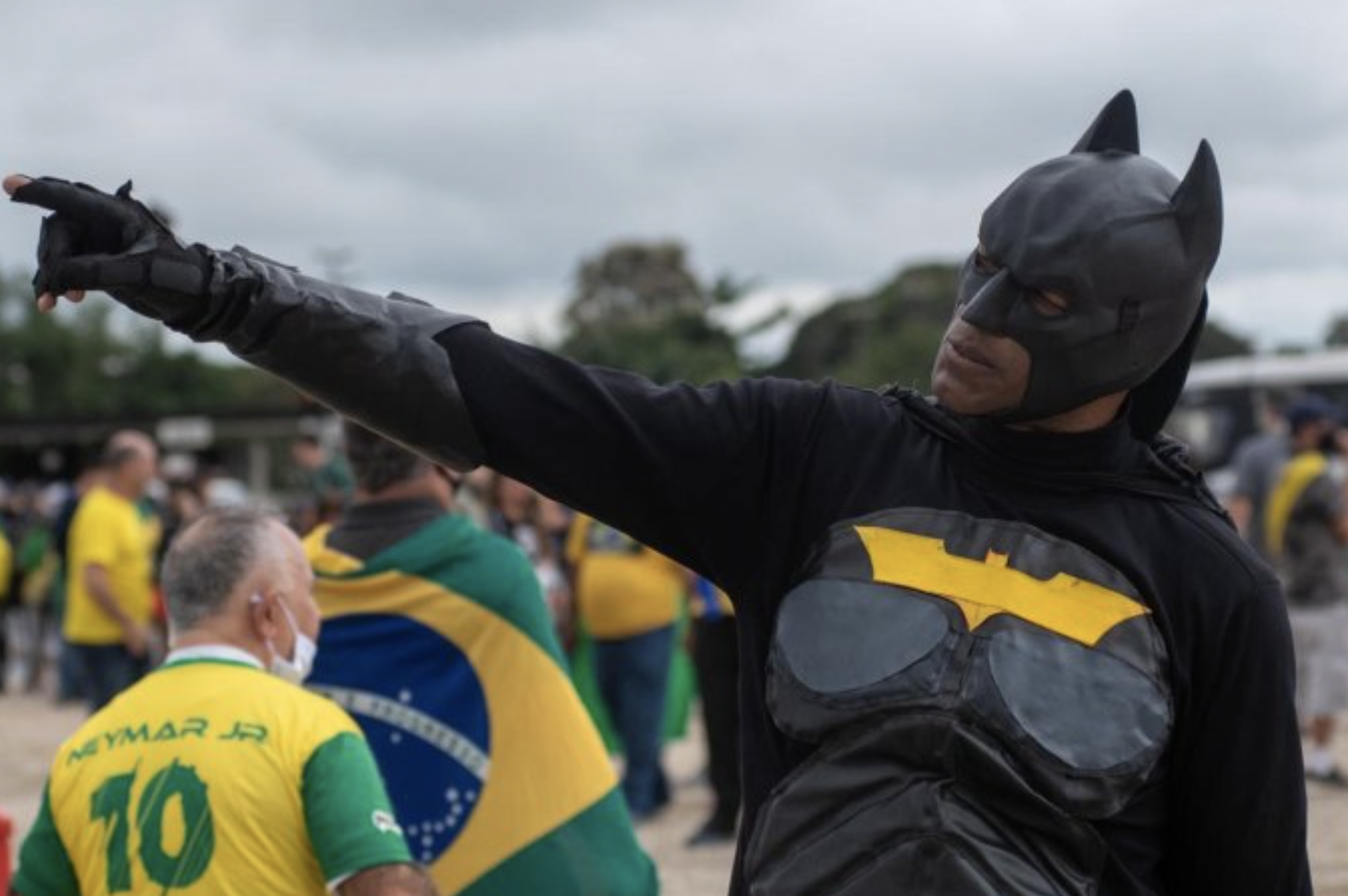 Fantasiado de Batman, um apoiador de Jair Bolsonaro tentou chegar aos manifestantes pró-democracia, mas foi impedido.