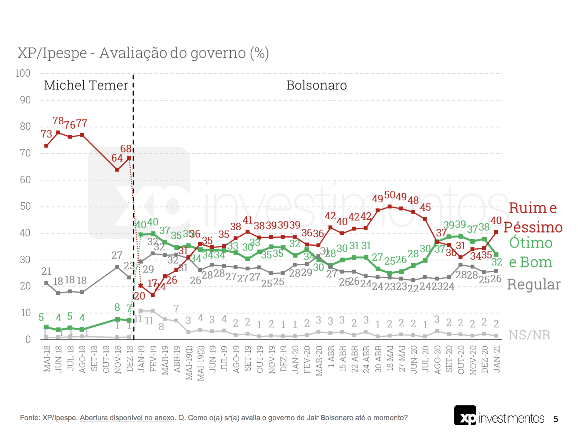 A rodada de janeiro da pesquisa XP/Ipespe mostra que subiu de 35% para 40% a parcela da população que considera ruim ou péssimo o governo de Jair Bolsonaro, percentual semelhante ao do início da pandemia de coronavírus, em abril de 2020.