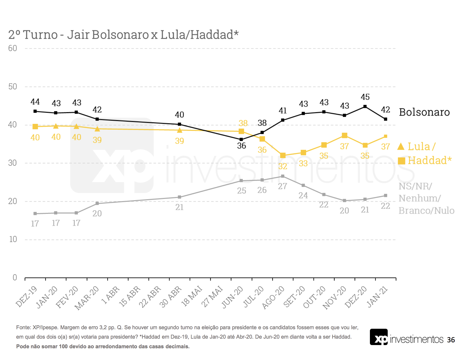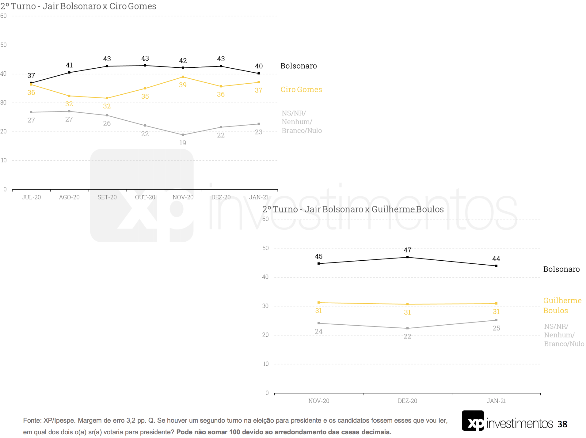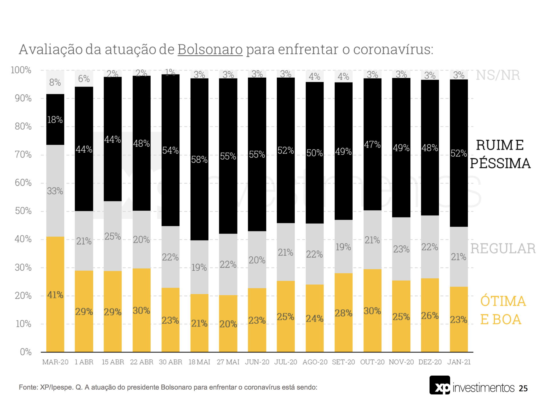 Pesquisa XP Janeiro 2021 (São Paulo): Avaliação positiva de Bolsonaro cai 6 p.p em janeiro, avaliação negativa sobe 5 p.p.