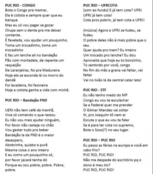 Já a turma da PUC-Rio provoca os estudantes de universidades com palavras de ordem ligadas a consumo e poder social: “Eu ando de Ferrari e você de Renault Clio. Passo férias na Europa e você em Cabo Frio. Uh, PUC-Rio! Uh, PUC-Rio!”. “Meu pai vai demitir seu pai” e “O seu pai é meu porteiro ÔôÔôÔ”.