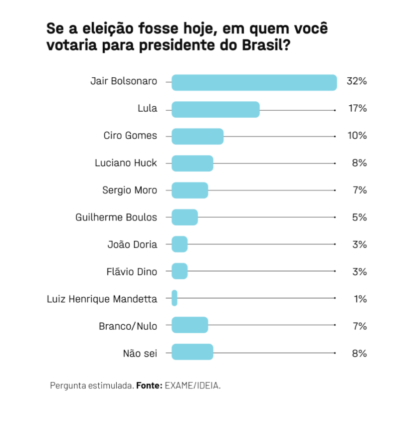 Quando a pesquisa vai para a concretude de um segundo turno, Bolsonaro venceria Lula (45% a 28%), Doria (45% a 30%) e Luciano Huck (41% a 38%).