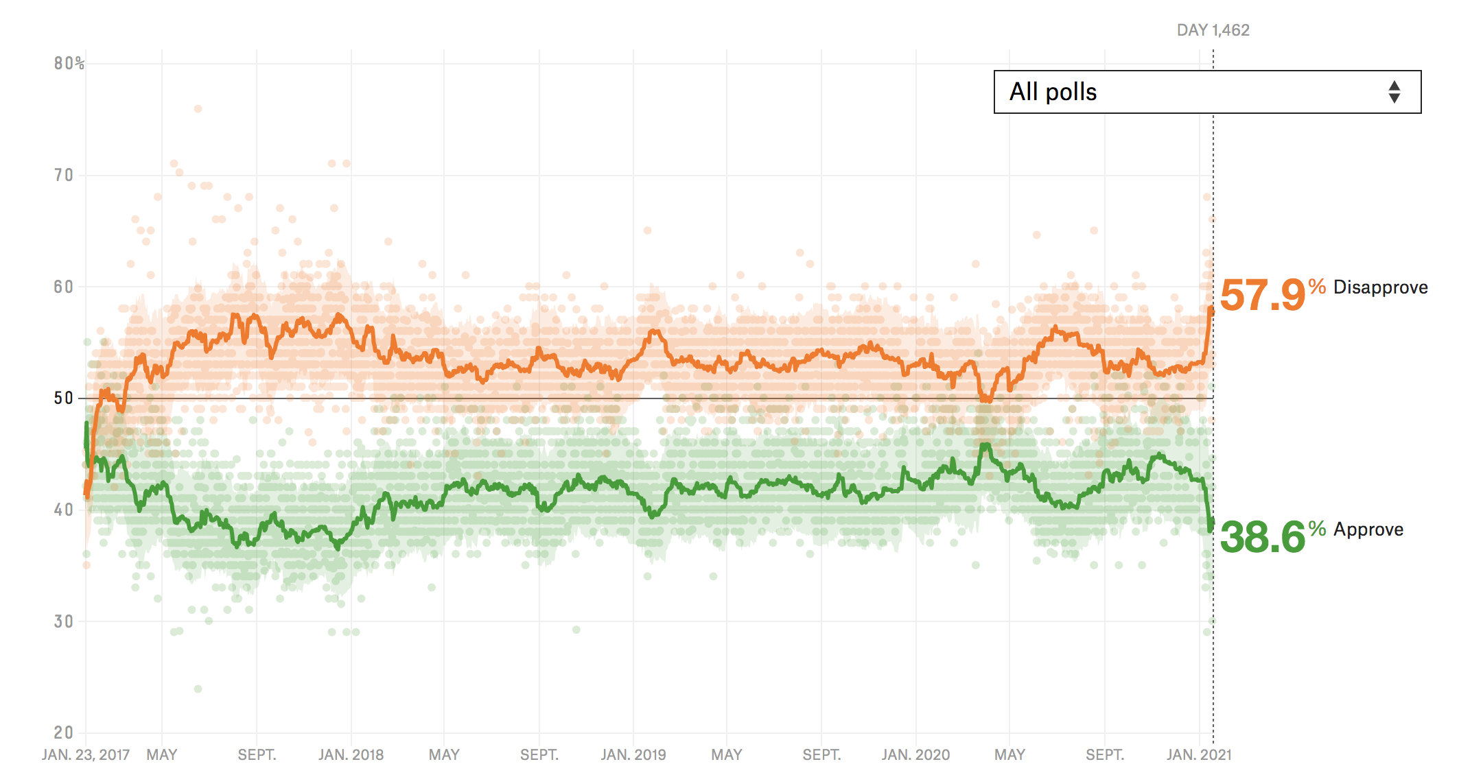 Trump nunca bateu nos 46% de aprovação durante seu governo, mas acabou com menos de 39% por causa da pandemia.
