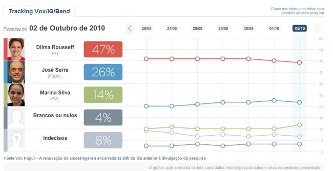 PS do Viomundo: Desculpem, leitores, fiz as contas baseado apenas no gráfico. Agora o IG publicou o texto relativo ao gráfico, falando em 53% dos válidos. Dilma precisa de 50% + 1.