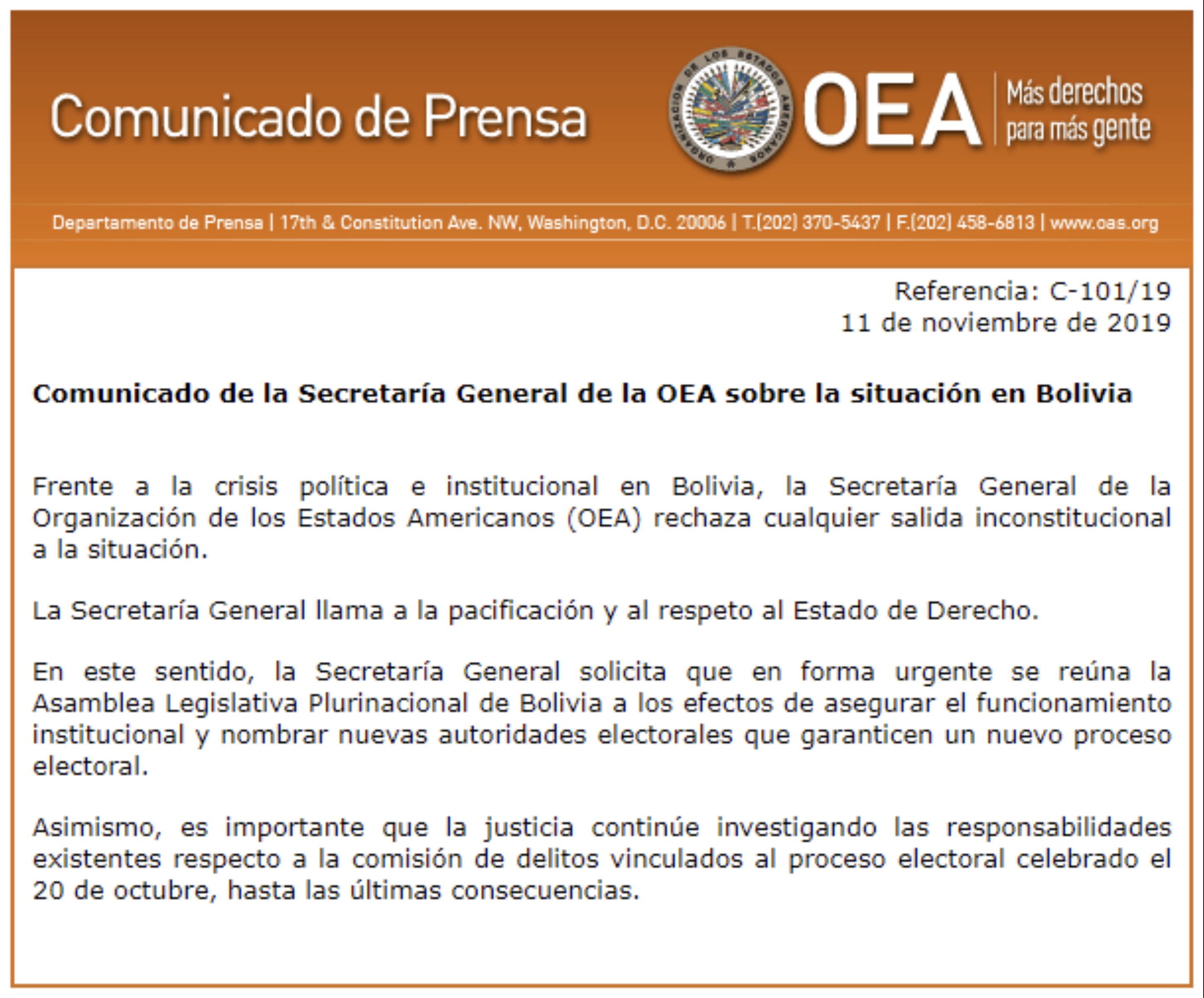 O secretário-geral Luis Almagro divulgou hoje nota rechaçando qualquer saída “inconstitucional” para a crise e pedindo que a Assembleia Legislativa Plurinacional da Bolívia se reúna para garantir um novo processo eleitoral.